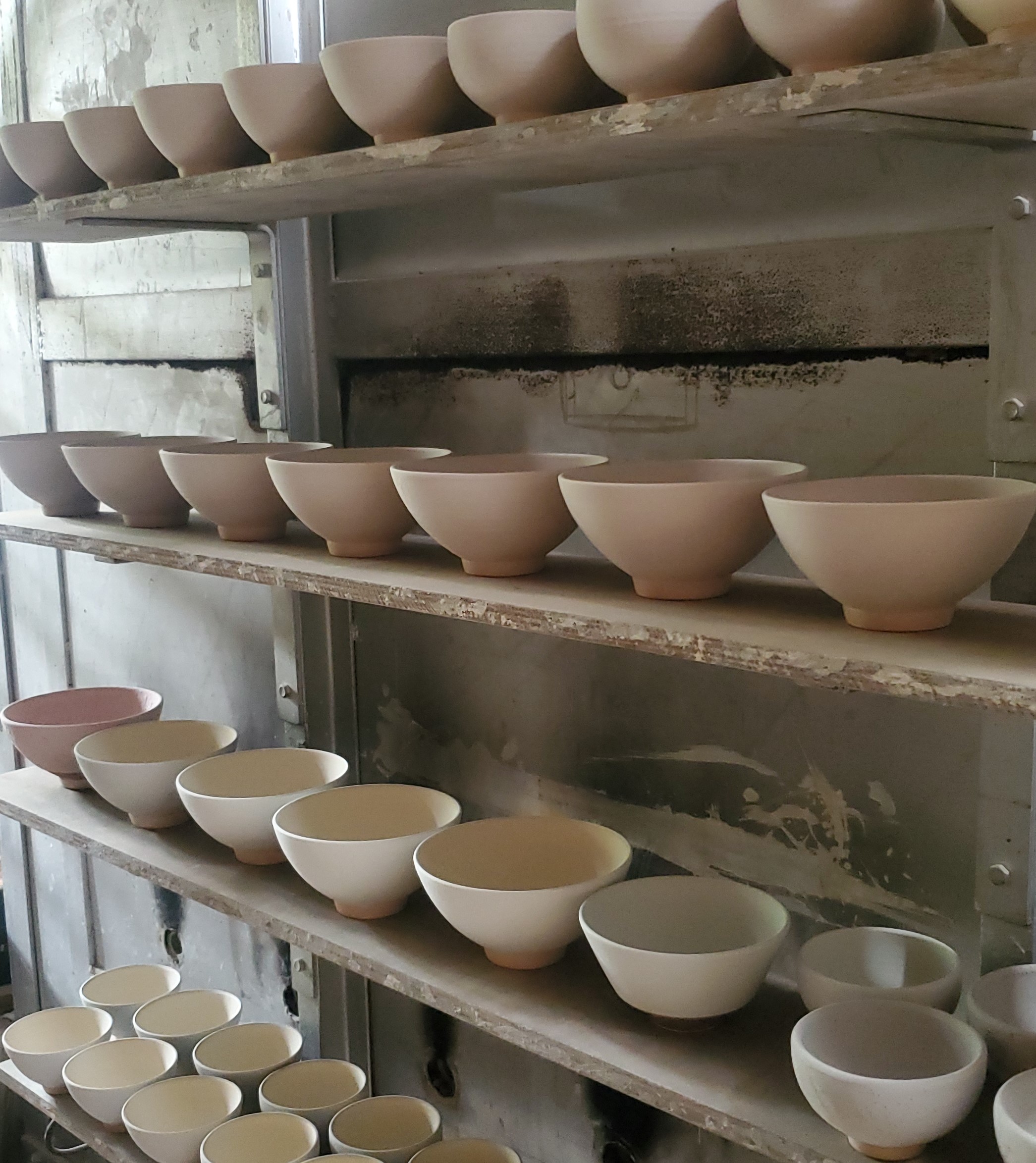 A l’atelier nous travaillons essentiellement le grès et la porcelaine avec cuisson à 1300°C, nous fabriquons également nos émaux à base de minéraux broyés et de cendres diverses.
